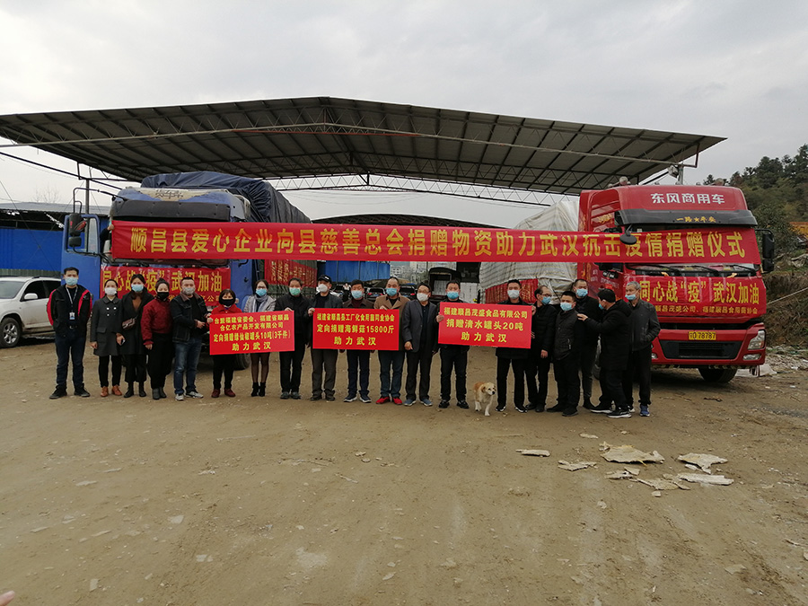 2020年3月6日,福建省順昌縣愛心企業(yè)向縣慈善總會定向捐贈的第二批物資助力武漢捐贈儀式在順昌縣綠通物流舉行。由臺盟福建省委會、福建省順昌合億農(nóng)產(chǎn)品開發(fā)有限公司捐贈的綠仙椒罐頭10噸(3千件)、福建順昌茂盛食品有限公司捐贈的清水罐頭20噸、福建省順昌縣工廠化食用菌同業(yè)協(xié)會捐贈的海鮮菇18800斤等物資帶著順昌人民與武漢人民共克時艱、共抗疫情的深情厚意無償馳援武漢。