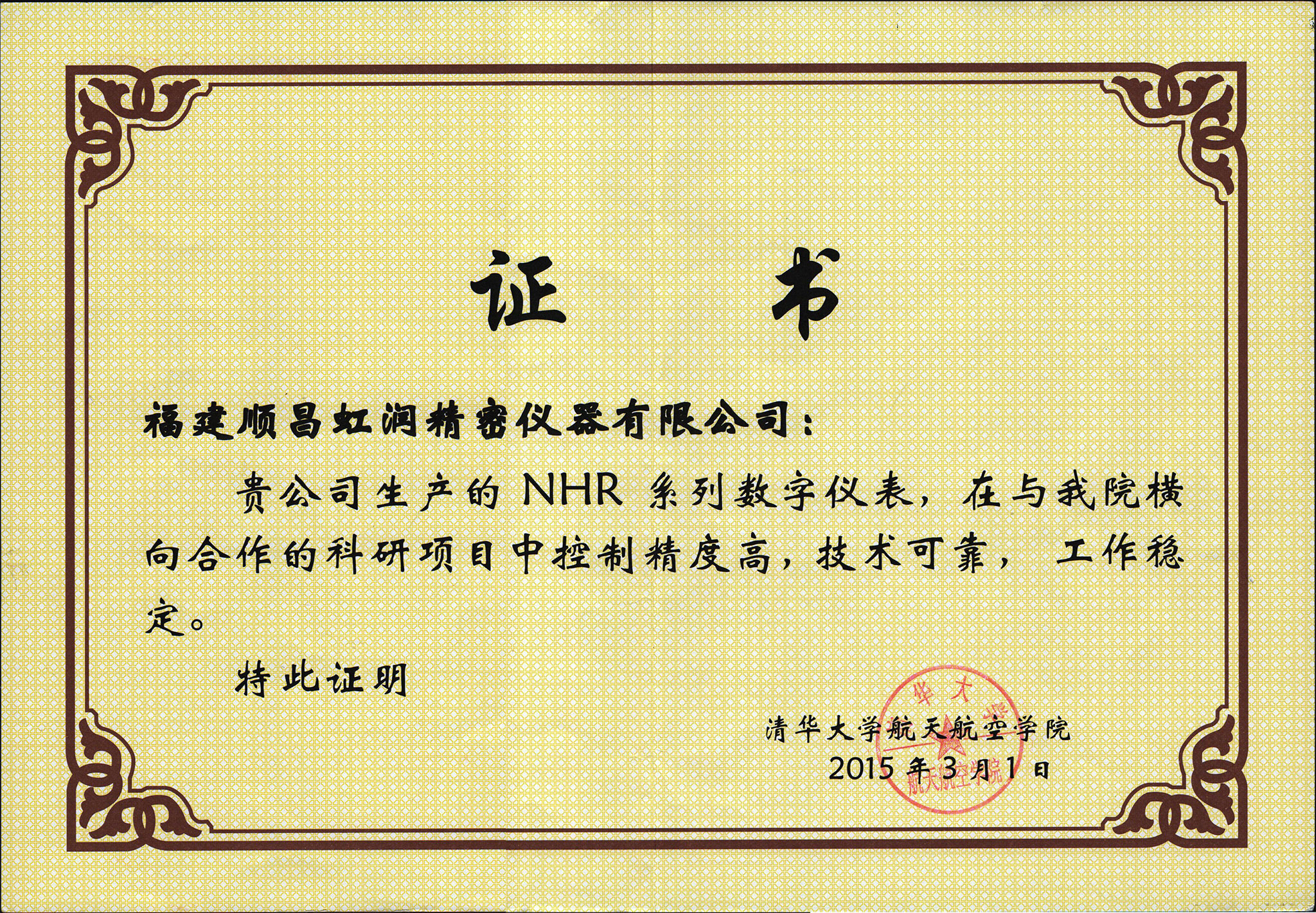近日,由虹潤公司生產(chǎn)的自動化顯示控制儀表產(chǎn)品,成功應用于清華大學航空航天學院橫向合作科研項目,因控制精準,抗干擾性強,運行穩(wěn)定,受到了清華大學航空航天學院科研項目組的廣泛好評,并向虹潤公司頒發(fā)了證書。
