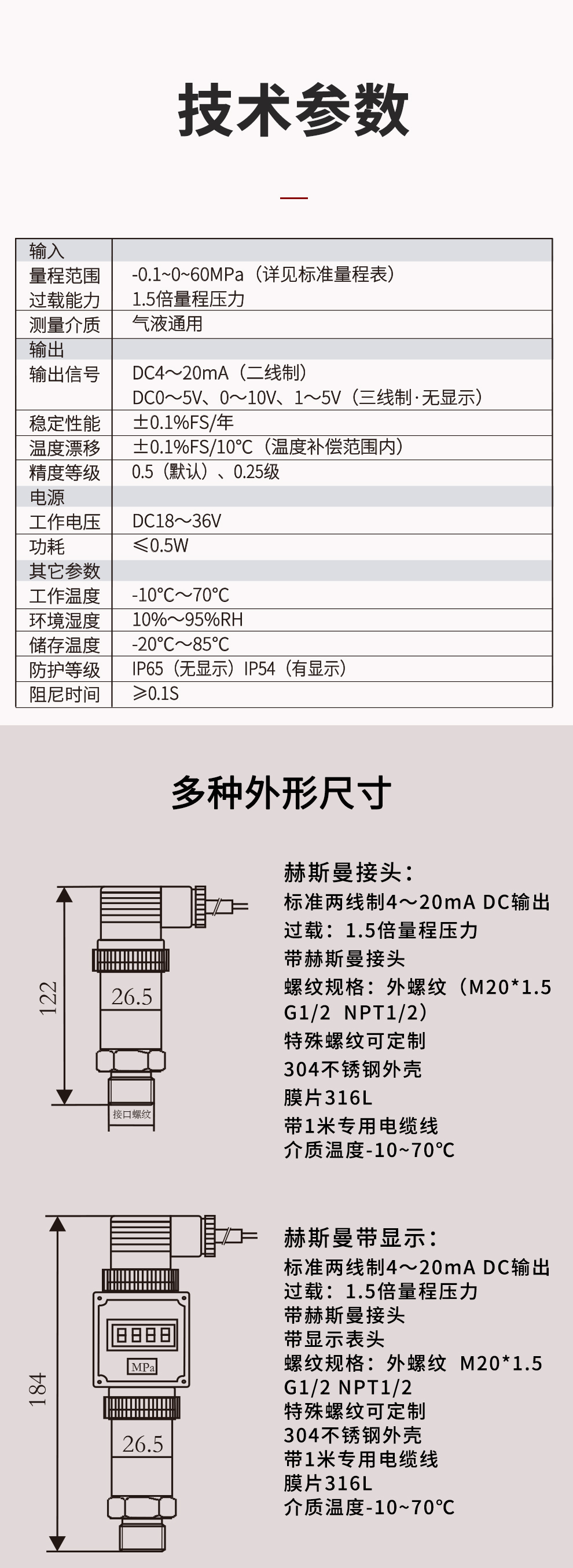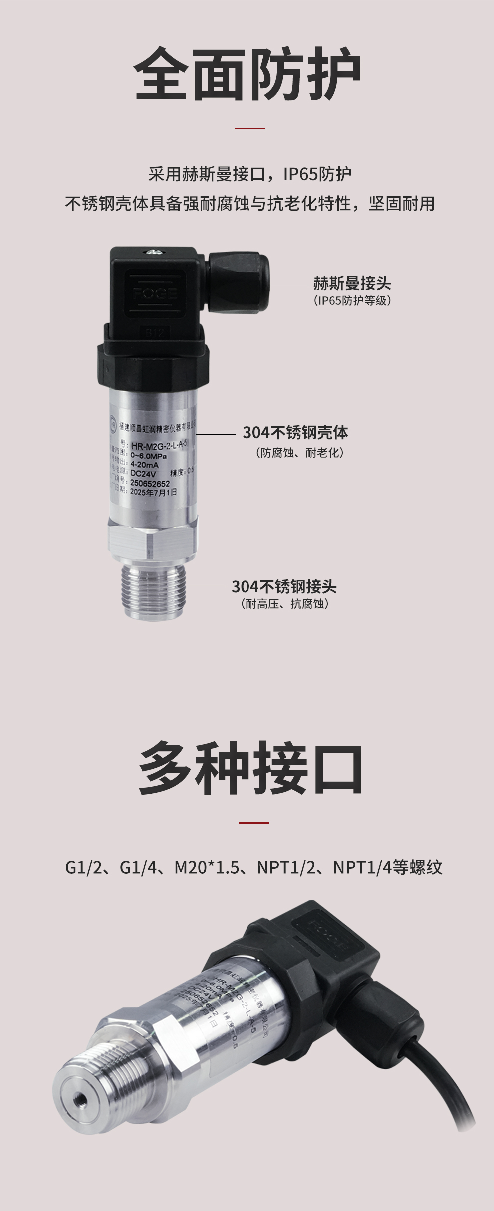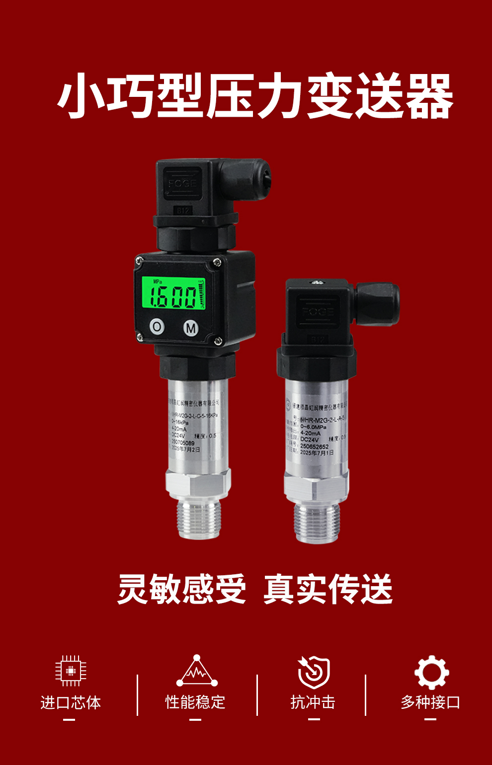 虹潤公司是專業(yè)生產(chǎn)壓力變送器的國家專精特新“小巨人”企業(yè),生產(chǎn)的小巧型壓力變送器,具有采用進(jìn)口芯體,量程范圍寬,抗沖擊抗震動(dòng),多種螺紋接口,性能穩(wěn)定等特點(diǎn)。產(chǎn)品獲得一種數(shù)字顯示低功耗壓力表、一種信號(hào)發(fā)生器裝置等2項(xiàng)國家發(fā)明專利,主持起草工業(yè)過程控制系統(tǒng)用模擬輸入兩位或多位輸出儀表、工業(yè)過程測(cè)量和控制系統(tǒng)用壓力/差壓變送器等2項(xiàng)國家標(biāo)準(zhǔn),通信系統(tǒng)多通道數(shù)據(jù)采集控制終端規(guī)范軍用標(biāo)準(zhǔn),以及現(xiàn)場(chǎng)設(shè)備集成等5項(xiàng)智能制造國家標(biāo)準(zhǔn),參與國際5G標(biāo)準(zhǔn)制定,取得數(shù)顯壓力表等2項(xiàng)相關(guān)軟件著作權(quán)。產(chǎn)品廣泛應(yīng)用于化工、食品、制藥、電力、設(shè)備配套、供暖、水處理、樓宇等行業(yè),需精準(zhǔn)測(cè)量流體壓力的現(xiàn)場(chǎng)。