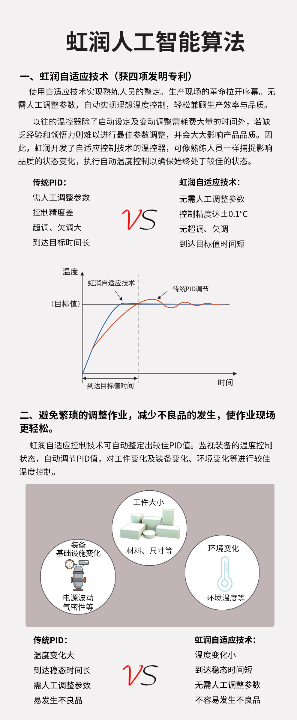 虹潤(rùn)公司是專業(yè)生產(chǎn)無(wú)紙記錄儀的國(guó)家專精特新“小巨人”企業(yè)。生產(chǎn)的觸摸屏溫控器,具有觸摸大屏顯示,真正人工智能算式,無(wú)需人工整定參數(shù),控制精度達(dá)士0.1°C, RS485/以太網(wǎng)通訊,5/7/9英寸可選等特點(diǎn)。產(chǎn)品獲得智能化控制器、人工智能調(diào)節(jié)器及調(diào)節(jié)方法、模糊PID控制儀及控制方法、平板無(wú)紙記錄儀、巡回檢測(cè)顯示方法及裝置等5項(xiàng)國(guó)家發(fā)明專利,主持起草物聯(lián)網(wǎng)智能記錄儀表通用技術(shù)條件、物聯(lián)網(wǎng)智能溫度儀表通用技術(shù)條件、工業(yè)過(guò)程測(cè)量和控制系統(tǒng)用智能調(diào)節(jié)器等3項(xiàng)國(guó)家標(biāo)準(zhǔn),通信系統(tǒng)多通道數(shù)據(jù)采集控制終端規(guī)范軍用標(biāo)準(zhǔn),以及空間數(shù)據(jù)與信息數(shù)據(jù)傳輸系統(tǒng)等2項(xiàng)航天標(biāo)準(zhǔn),參與國(guó)際5G標(biāo)準(zhǔn)制定,取得觸摸屏彩色調(diào)節(jié)無(wú)紙記錄儀等3項(xiàng)相關(guān)軟件著作權(quán)。產(chǎn)品廣泛應(yīng)用于電力、石化、冶金、化工、食品、制藥、熱處理、水處理、機(jī)械配套等諸多領(lǐng)域。