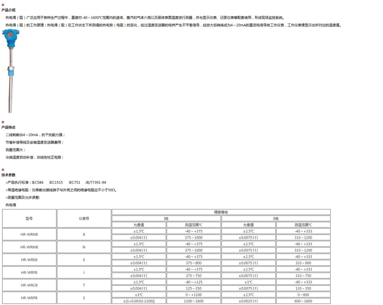 帶溫度變送器熱電偶(阻),由基準源、冷端補償、放大單元、線性化處理、V/I轉(zhuǎn)換、斷偶處理、反接保護、限流保護等電路單元組成。它是將熱電偶(阻)產(chǎn)生的熱電勢經(jīng)冷端補償放大后,再帽由線性電路消除熱電勢與溫度的非線性誤差,最后放大轉(zhuǎn)換為4~20mA電流輸出信號。